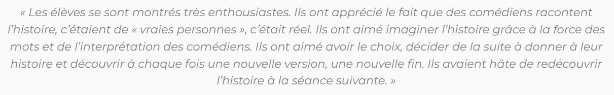 - Des comédiens jouent et l’enfant décide du dénouement en renforçant sa personnalité, ses prises de décisions et son autonomie ;
