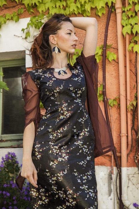 Mes créations jonglent avec l’ethnique, le glamour, le chic et l’élégance. Mon univers est haut en couleur, on y retrouve des formes géométriques et des motifs imprimés variés.
