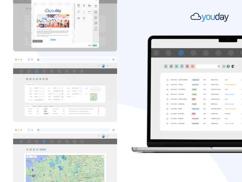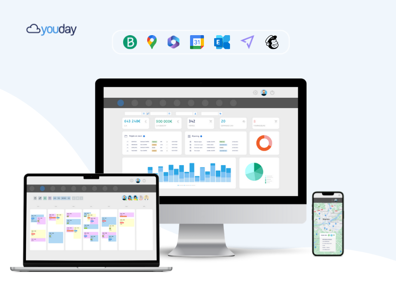 Youday CRM permet une centralisation complète des données de l’écosystème de ses clients : gestion des contacts (référentiel des sociétés/organismes et des contacts en lien avec la structure), suivi des affaires et des projets, production automatisée de documents, calendrier, e-mails, gestion commerciale/ERP (base articles, devis, commandes, factures, règlements), ciblage marketing, etc.