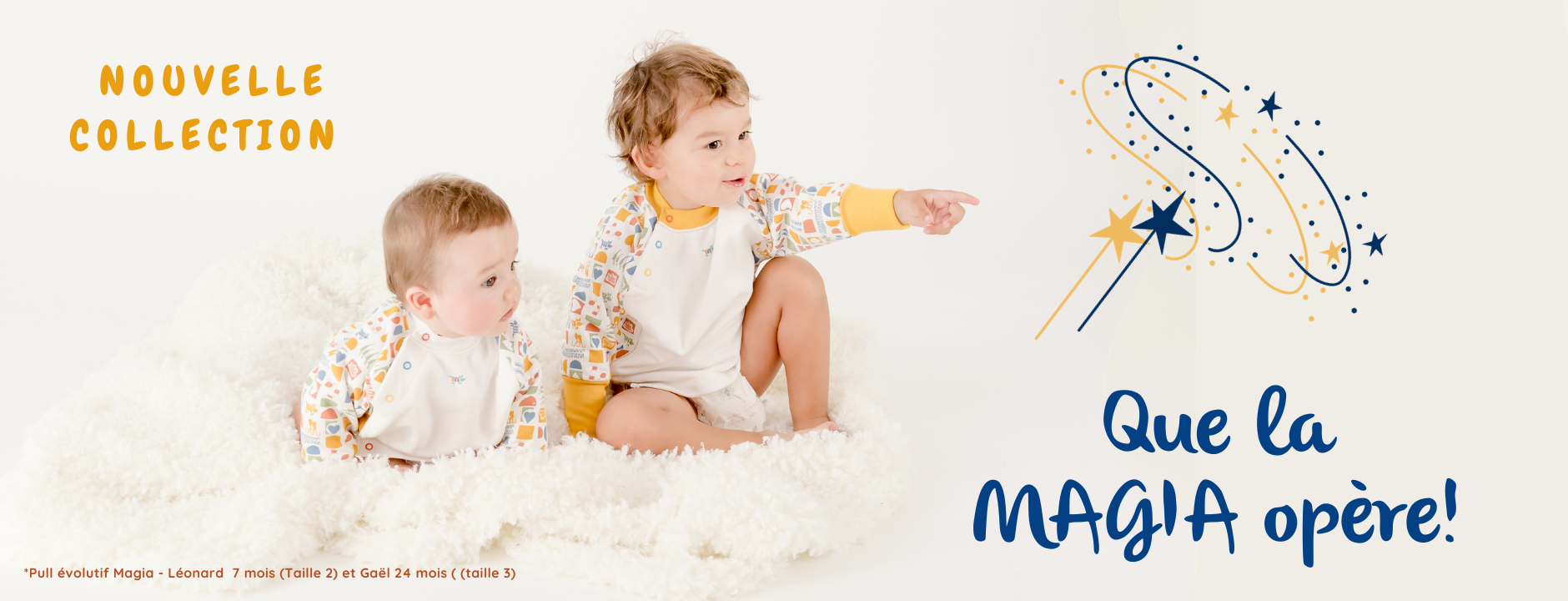 Composée de 7 nouveaux produits inédits et révolutionnaires, la collection Magia se décline en trois tailles pour les enfants âgés de 0 à 24 mois :