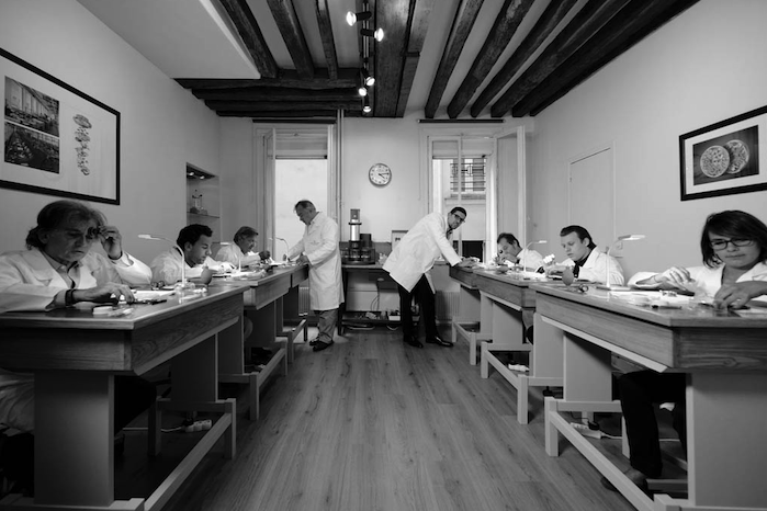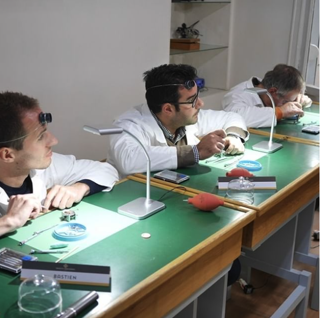 Guidés par des experts horlogers instructeurs, pédagogues et bienveillants, les « apprentis » endossent blouse blanche et monocle après s’être glissés derrière l’établi.