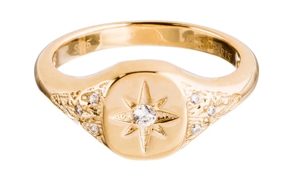 Cette bague chevalière en vermeil jaune 18 carats est dotée de zircons en forme d’étoile, sur le dessus et sur les côtés.