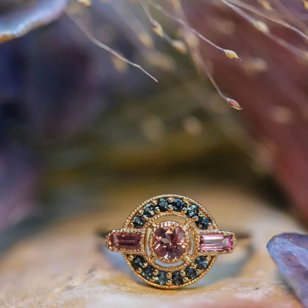Bague en Vermeil or 18 carats, ornée de pierres fines et réalisée sur mesure.
