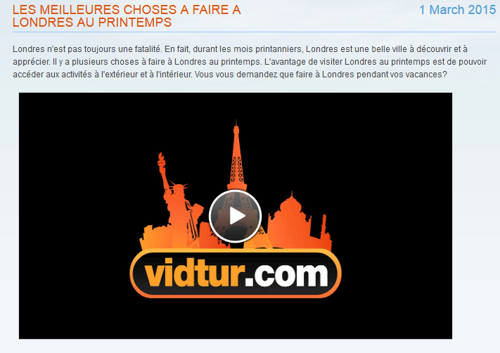 Vidtur est un site internet qui met à disposition des voyageurs du monde entier des centaines de vidéos sur les destinations phares. Les touristes peuvent ainsi préparer leur voyage efficacement, et planifier leurs visites. Ces guides de voyage nouvelle génération offrent de nombreux avantages aux clients qui peuvent ainsi organiser leurs vacances avant de partir, et ainsi gagner du temps !