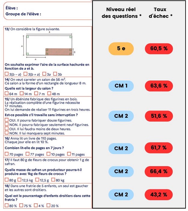 Si l’élève a plus de 13 bonnes réponses sur 22, son niveau est déclaré comme “Satisfaisant”. Or, là encore, 14 questions sur les 22 sont de niveau CE1 à CM2.