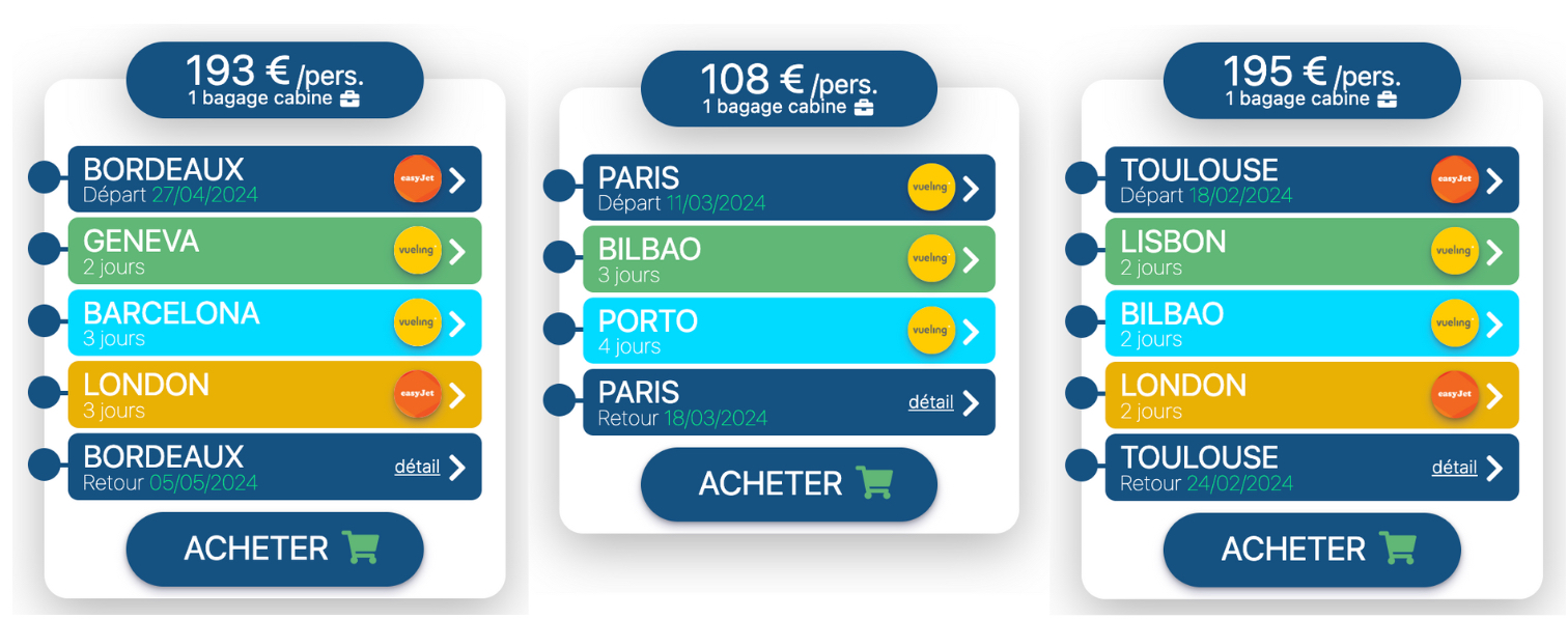 Il combine les vols les moins “chargés” pour construire des voyages multi-destinations optimisés en fonction des préférences de l’utilisateur. Les vols, mis “bout à bout”, constituent un véritable parcours en Europe.