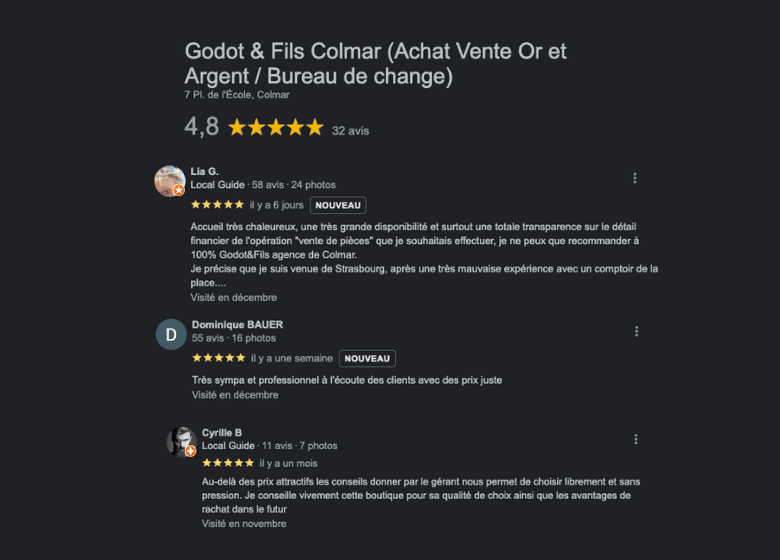 En véritable pionnière de l’achat et vente d’or et d’argent, cette entreprise familiale a su se démarquer de ses concurrents et s’imposer durablement dans le secteur. Reconnu par les instances de contrôle (ACPR, SNCAF, AEE), Godot & Fils possède aujourd’hui un réseau de plus de 70 agences reparties entre Paris, la province et les DOM.