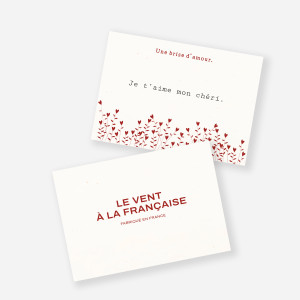 Ode à l’amour, ces créations sont idéales à offrir à son ou sa bien-aimé(e). Le Vent à la Française propose également des cartes à écrire pour laisser un petit mot d’amour dans les commandes.
