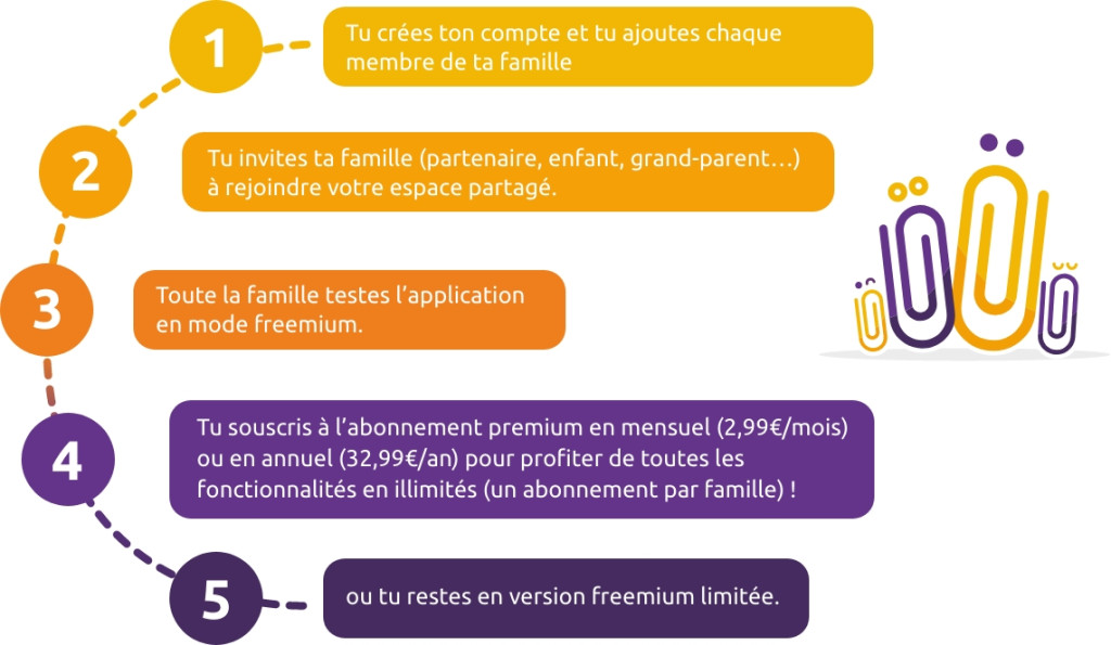 - La version Freemium : entièrement gratuite, cette version permet la fonctionnalité To Do List, 3 tâches partagées, 1 liste de courses (10 articles maximum) et 3 recettes aléatoires par jour.