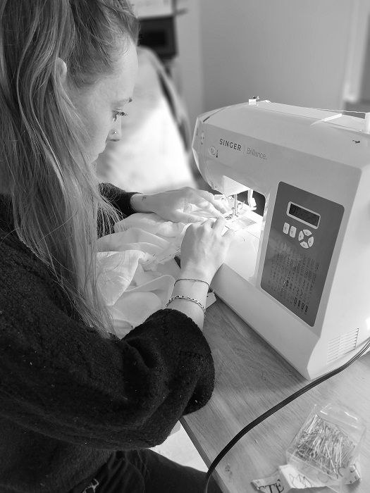En 2015, elle achète sa première machine à coudre et commence à regarder des tutoriels en ligne pour apprendre à coudre. Sa première réalisation : sa propre robe de mariée.