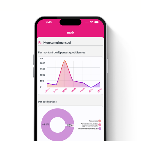 Avec Notes de frais, le suivi de ses frais professionnels est intuitif. L’utilisateur accède à un tableau de bord détaillé par catégorie ainsi qu’un historique complet de ses dépenses pour une visibilité totale. Il dispose aussi de graphiques visuels avec courbe de dépenses journalières.