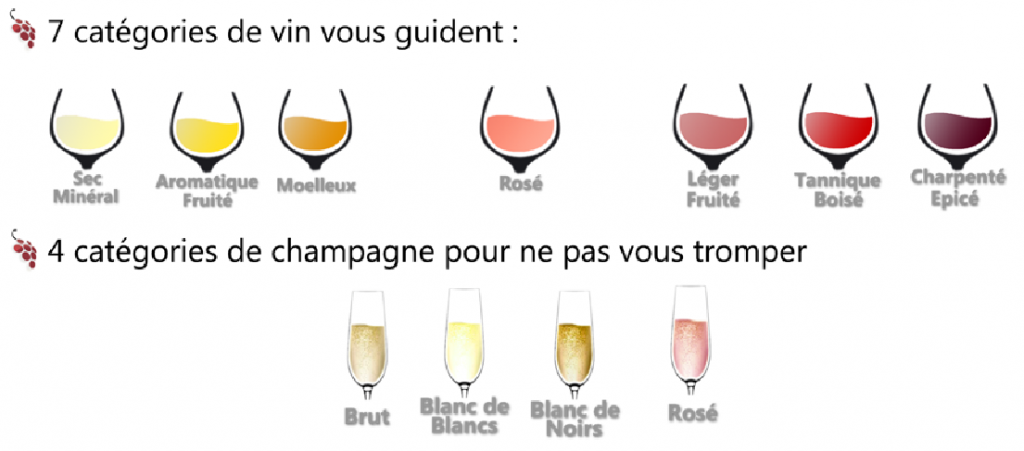 Les catégories ainsi répertoriées permettent de choisir aisément son vin et son Champagne sans prendre le risque de se tromper ou de ne pas aimer.