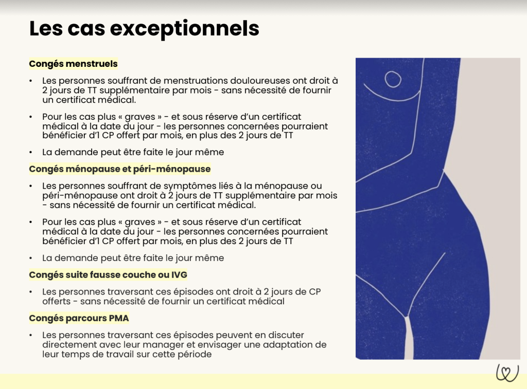 - Accompagnement de la ménopause : La ménopause et la péri-ménopause sont reconnues et (enfin) prises en compte par des options de télétravail et des aménagements personnalisés, soulignant l’importance du confort et de la santé des employées à tous les stades de leur vie.