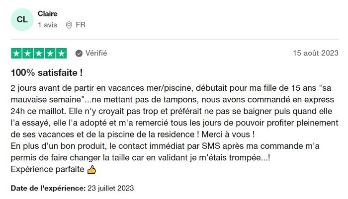 Viviane : “Au départ, j’étais sceptique car avec un flux abondant, impossible de me baigner, Mais là ! Incroyable. Il peut être utilisé même avec 1 flux abondant. Je recommande.”