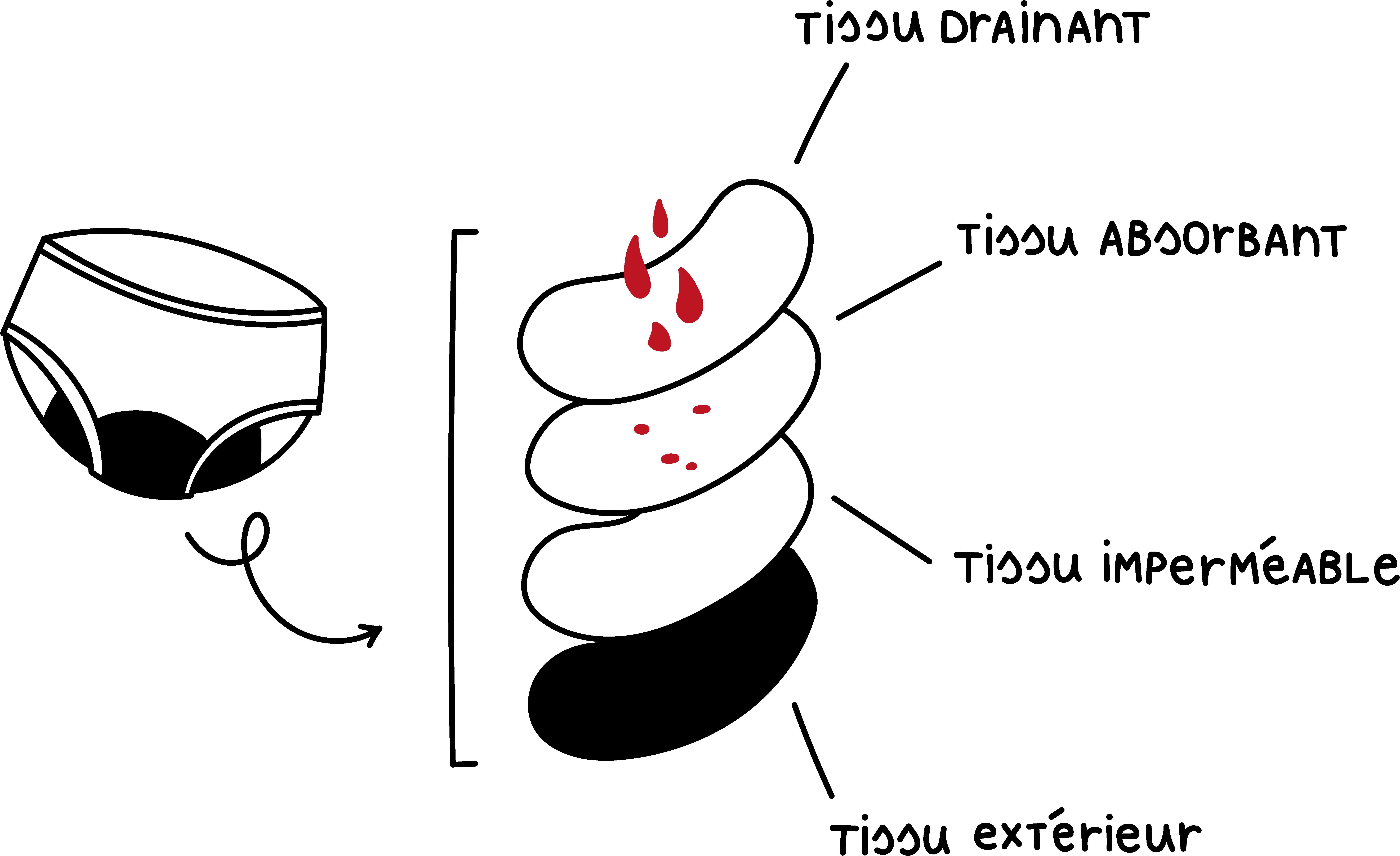1. Tissu drainant : en contact direct avec la peau, il recueille rapidement le flux menstruel et le transporte dans l’absorbant.