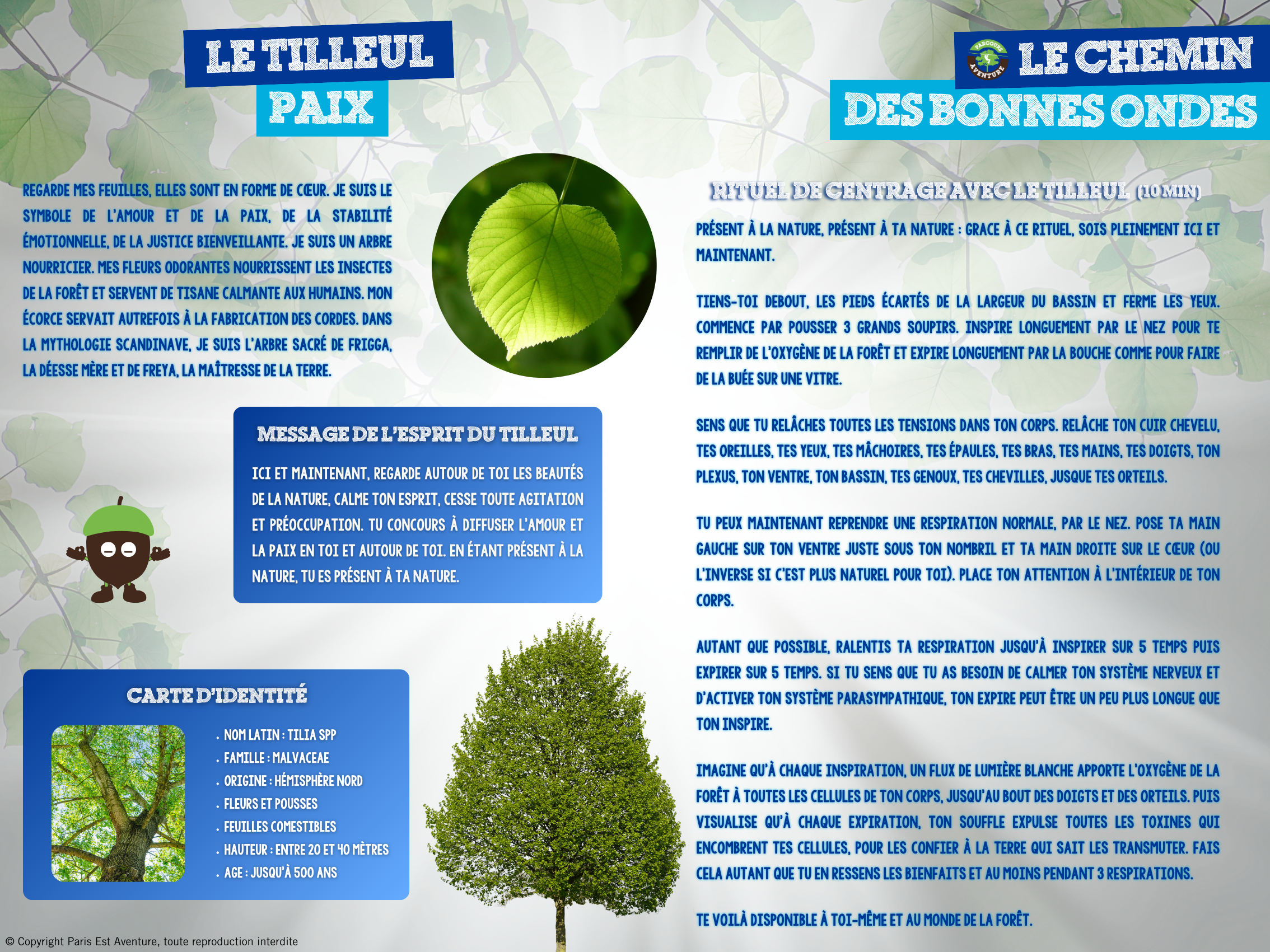 Les promeneurs au sol peuvent suivre l’itinéraire qui les invite à se recentrer, s’ancrer, respirer profondément, etc. En pratiquant des rituels universels en connexion avec les arbres, en découvrant leurs messages sacrés, ils pourront ouvrir leur cœur, se reconnecter à leur nature profonde, déposer leurs soucis et pensées encombrantes.