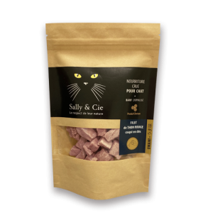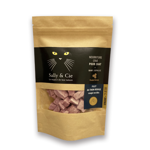 Spécialiste de la haute gastronomie féline et réputée pour ses croquettes BARF exclusivement composées de viandes et poissons crus, Sally & Cie lance un produit unique au monde : le Filet de thon rouge en dés.
