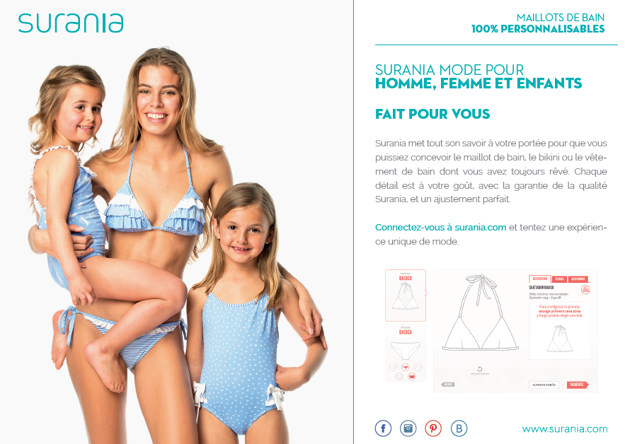 Destinée aux hommes, aux femmes et aux enfants, Surania conjugue tendance et sur mesure, renforçant sa différence sur le marché de la mode de bain. Chaque client réalise son maillot selon ses envies et ses besoins, en choisissant le modèle, le style, le tissu et les accessoires parmi une large gamme de propositions.