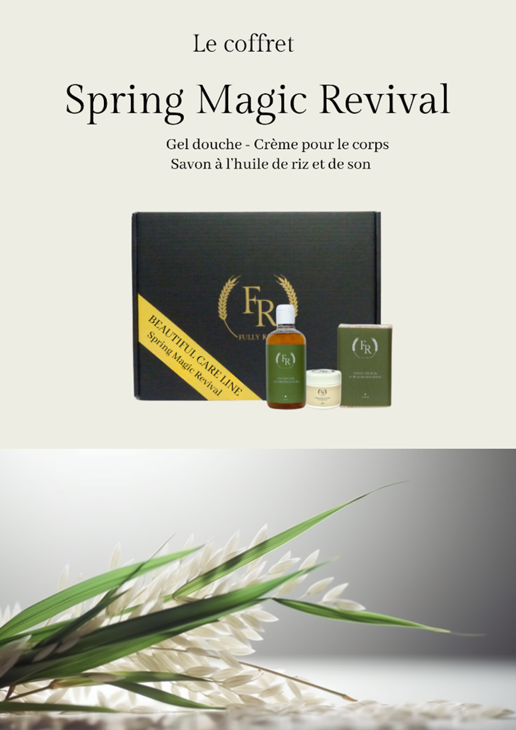 Destiné à toutes les femmes désireuses de choyer leur peau avec des soins à la fois doux, efficaces et respectueux de l’environnement, le coffret “Spring Magic Revival” se compose de trois produits essentiels : un gel douche aux protéines de riz, une crème pour le corps à l’huile de riz et un savon végétal enrichi en huile de riz et en son.