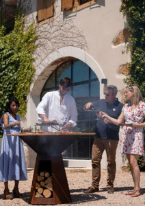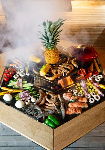 Totalement adaptables, la cuve et le plateau peuvent quitter le pied haut pour rejoindre l’accessoire pied bas. En soirée, la clientèle s’installe dans des canapés ou chaises extérieures dans une ambiance plus lounge avec un brasero qui éclaire, qui chauffe et qui naturellement peut aussi cuire des aliments.