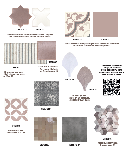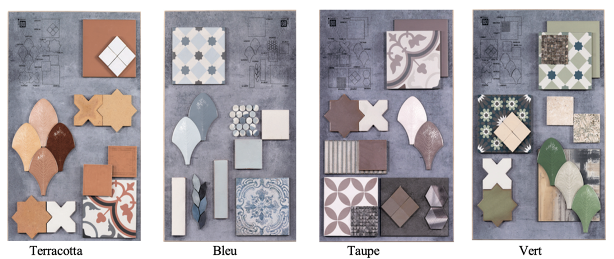 - Scénarisation des produits : Des tableaux d’inspiration qui mettent en valeur les carreaux au sein de compositions élégantes.