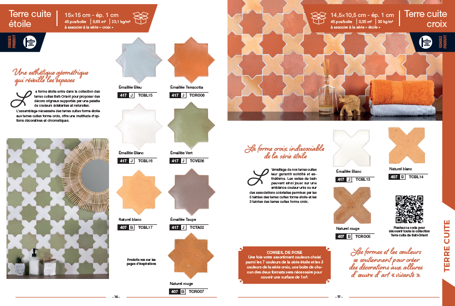 Cette année 2024 voit l’introduction de nouvelles nuances pour les collections emblématiques de la marque : carreaux ciment, céramiques inspiration ciment et inspiration zellige. On retrouve également de nouveaux motifs tels que les carreaux en terre cuite formes étoile et croix, qui permettent de réaliser de véritables œuvres d’art.