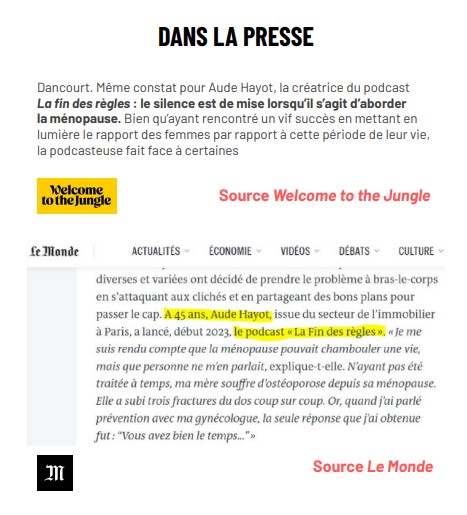 En janvier 2023, Aude prend la décision audacieuse de se consacrer pleinement au podcasting, une plateforme qu’elle utilise pour explorer et discuter des questions féminines souvent négligées ou mal comprises telles que la ménopause.