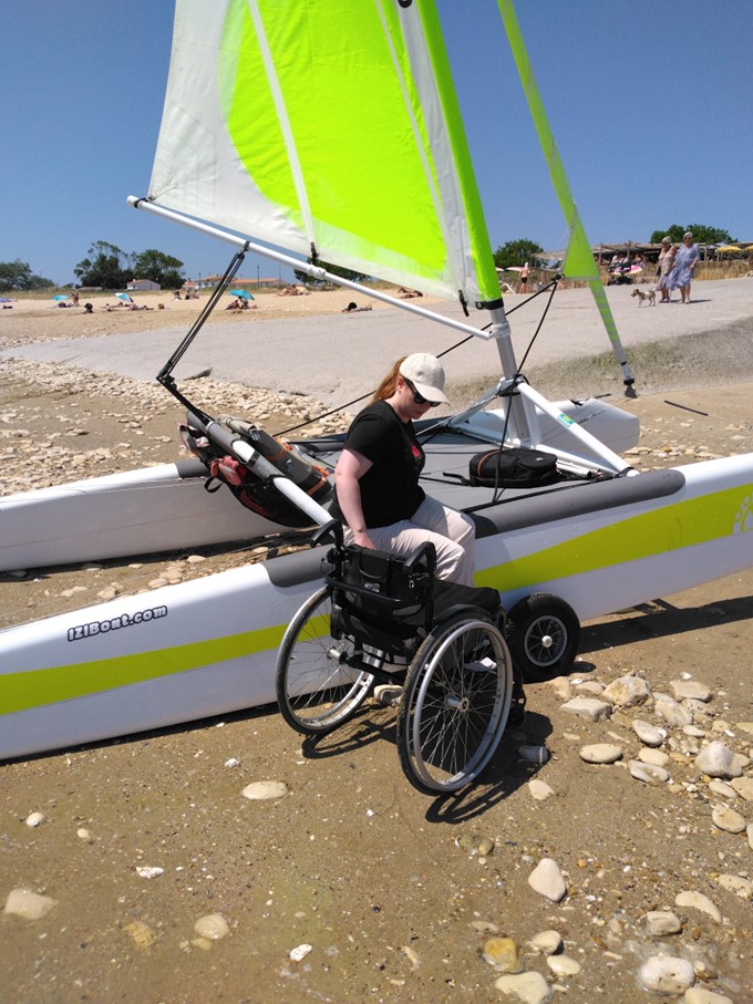 Le flotteur a été porté à 510 litres pour plus de sécurité, son franc bord a été renforcé pour permettre au PMR de faire leur transfert confortablement sans effort directement sur la plage, la gestion des écoutes a été revue pour un pilotage comme en voiture (tout à portée de main sans aucun effort).