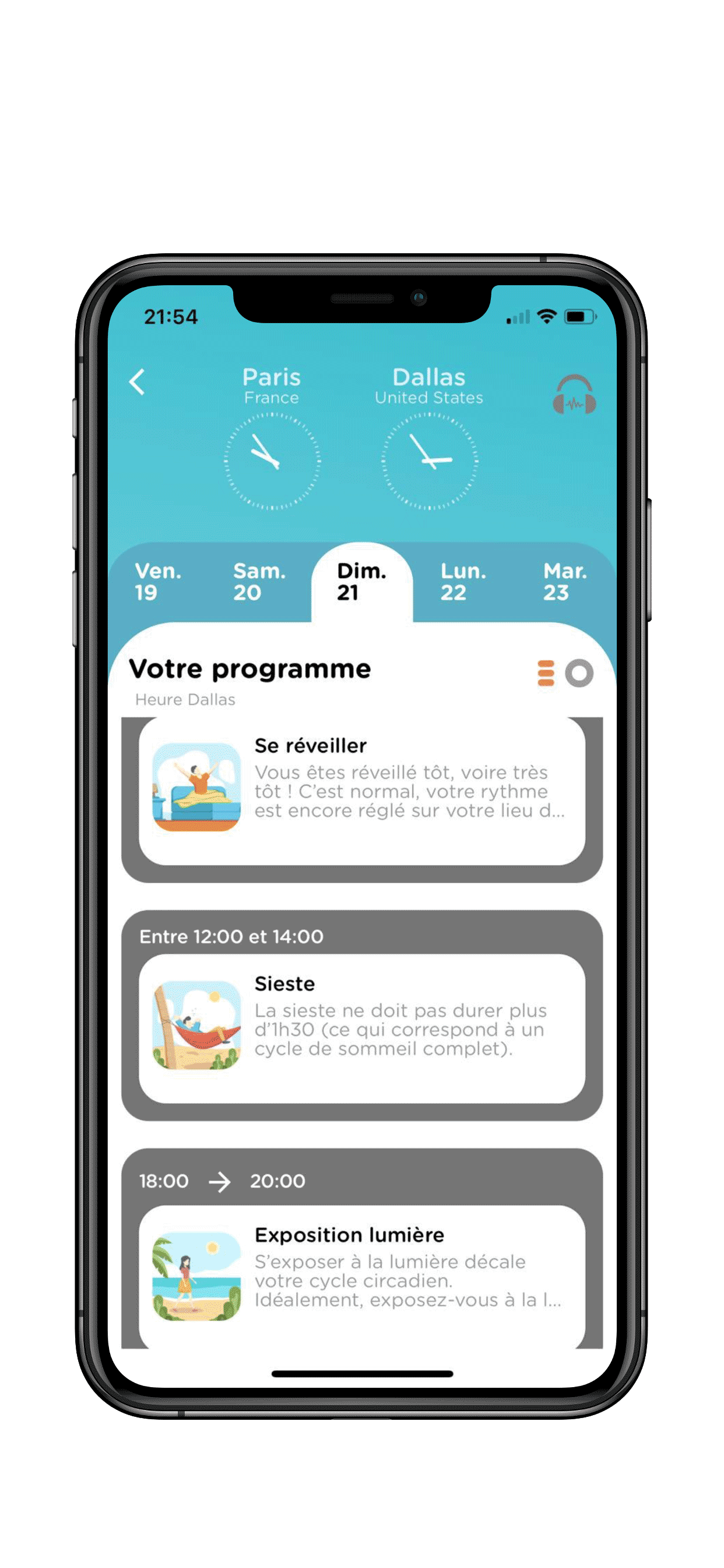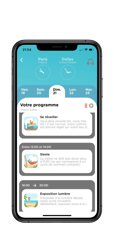 Les utilisateurs entrent des informations telles que leurs habitudes de sommeil et les détails du vol pour générer un programme sur mesure. Ce programme débute la veille du départ et guide les utilisateurs sur quand s’exposer à la lumière, quoi manger, et quand faire de l’exercice pour s’adapter rapidement au nouveau fuseau horaire durant les premiers jours à destination.