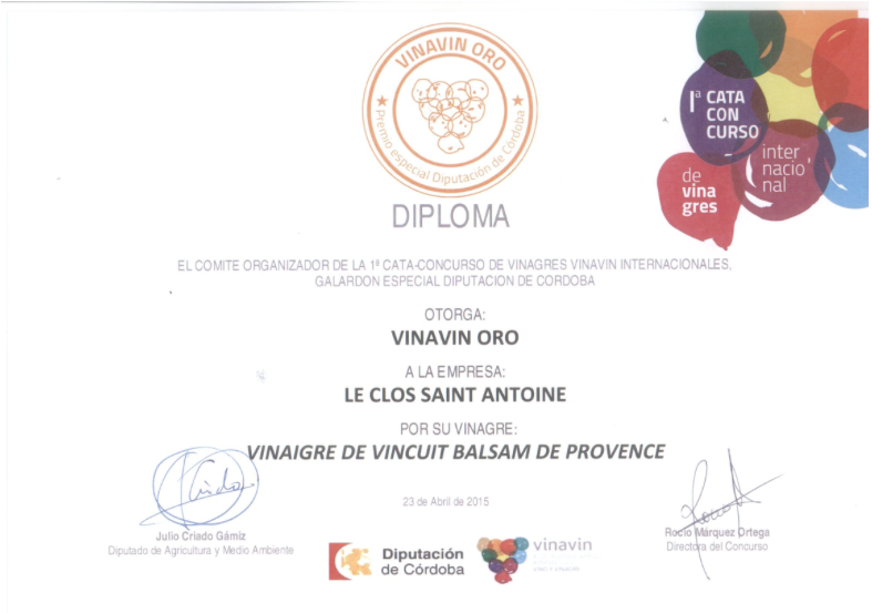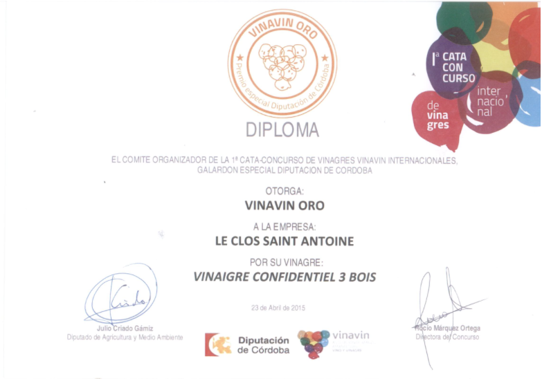 Au-delà des diplômes, médailles et de la fierté que j’en retire (si, si j’ose le dire !), ce concours est une belle reconnaissance de mon travail de « petit » artisan. C’est un honneur et un plaisir de voir mes vinaigres sublimés par les chefs de restaurants espagnols de prestige, présentés dans des salons et foires gastronomiques et publiés dans le « Guide International 2015 du vinaigre VINAVIN ».