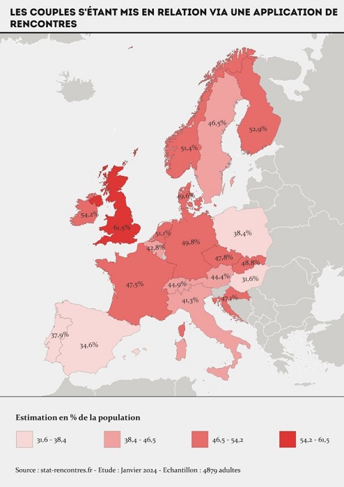 Un premier constat s’impose : l’utilisation des applis de rencontres est définitivement entrée dans les mœurs, mais il y a d’importantes disparités entre les pays européens.