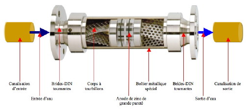 Le fonctionnement du système breveté de traitement d‘eau AQUABION® repose sur la combinaison d’une anode de zinc de grande pureté avec une diversité de chambres à tourbillon.
