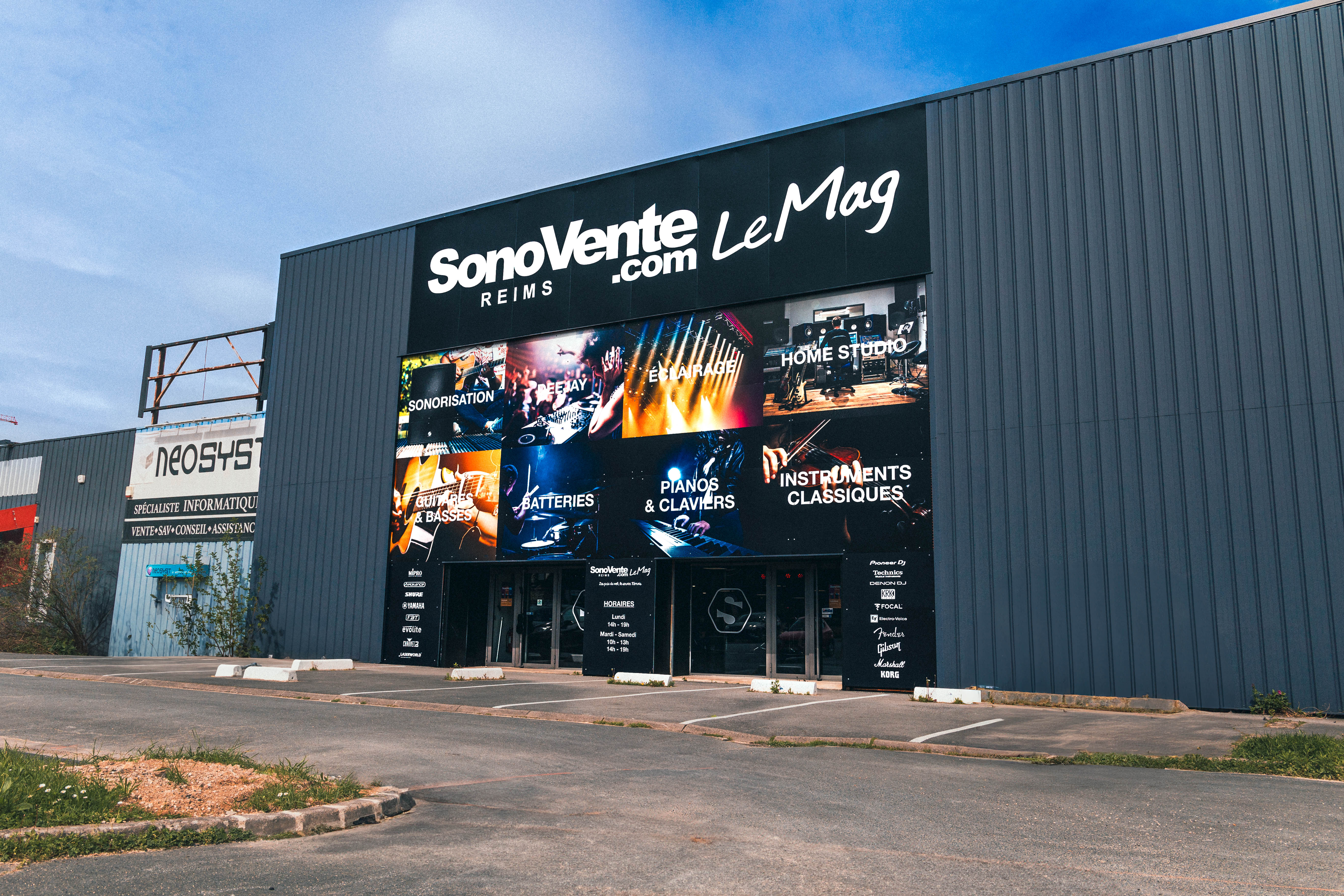 Situé au 1 Rue Anatole France à Tinqueux, le nouveau magasin SonoVente.com se compose d’un espace de 1 000m² entièrement dédié au matériel de sonorisation, d’éclairage et DJ et aux instruments de musique. Des centaines de produits sont en libre utilisation, afin que chacun puisse les tester avant de les acheter.
