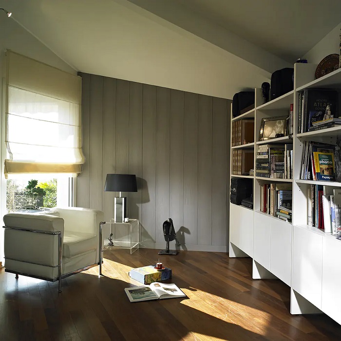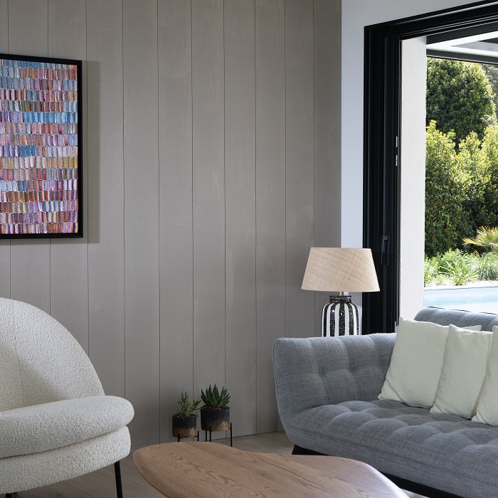 On aime les larges lames de ce lambris en pin maritime qui présente un original profil bord à bord et une finition hydrocire mate qui fait ressortir la matière bois.