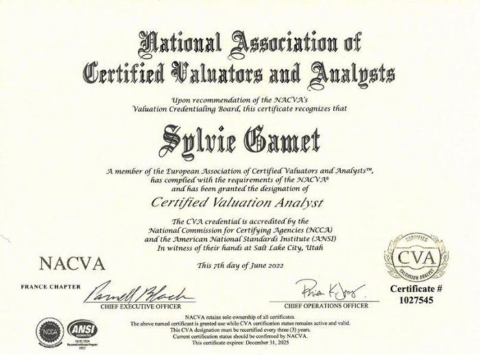 Or actuellement, tandis que l’Allemagne ou l’Italie dénombrent quelques dizaines d’experts certifiés (CVA , pour Certified Valuation Analyst), et les États-Unis des centaines, la France n’en dénombre… qu’une seule : Sylvie Gamet, CEO de Finantis Value.