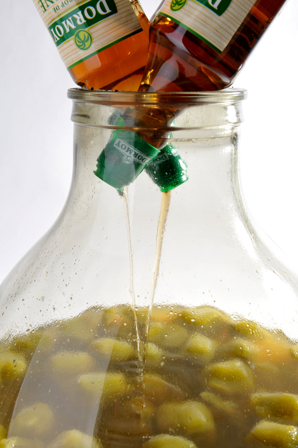 Pour profiter de la contenance dans sa totalité, les bonbonnes de 25 litres sont filtrées dès que le test gustatif est validé. Les fruits gorgés prendraient trop de place et seraient difficiles à extraire des bouteilles. De plus, certains ingrédients doivent être retirés après un certain temps de macération. Les arrangés gardent évidemment leurs délicieux goûts, tout en étant limpides et agréables en bouche.