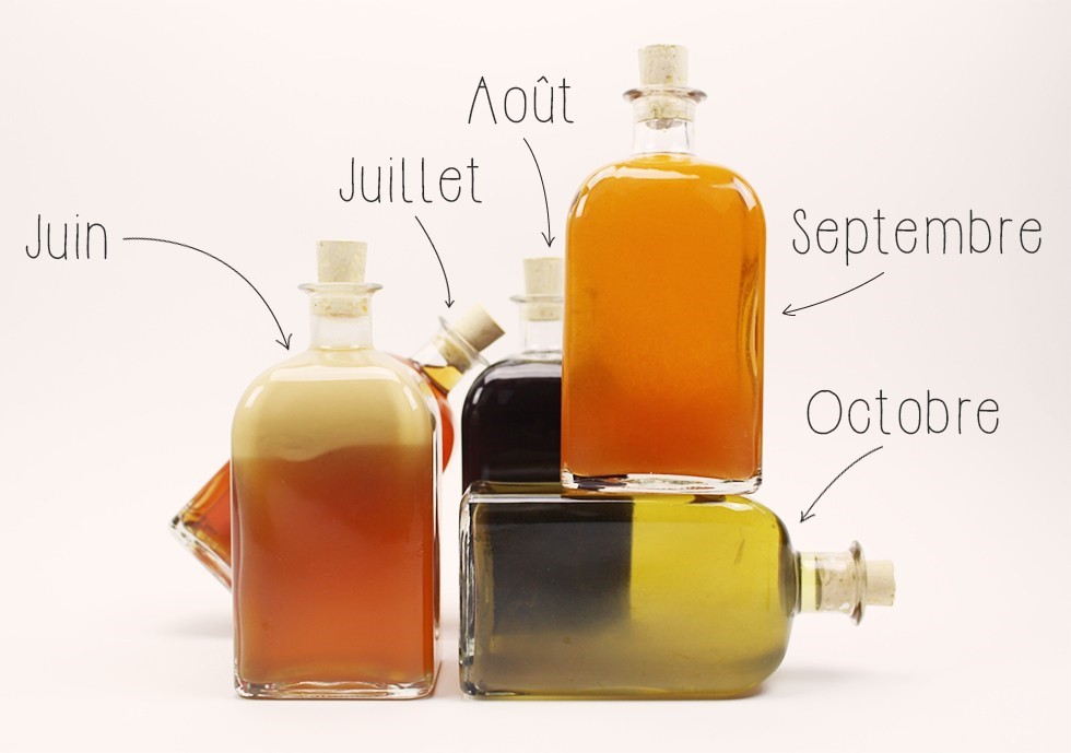 Stockées dans un endroit protégé de la lumière, elles sont remuées chaque semaine pendant 6 mois jusqu’à obtention d’une parfaite macération.
