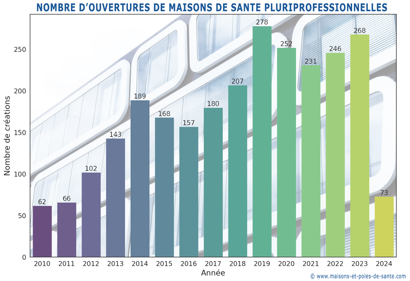 Derrière cette transition se cache une recherche croissante d’efficacité, de mutualisation, de collaboration interprofessionnelle et d’intégration et de partenariat avec les patients au sein de maisons et centres de santé. Cette nouvelle forme d’exercice est également garante d’une quête de qualité, de sécurité, de continuité et d’accessibilité aux soins. En mars 2023, 2 251 maisons de santé étaient en fonctionnement avec l’objectif ambitieux d’atteindre 4 000 maisons à travers le pays d’ici 2027 (source). Début 2024, on recensait environ 2500 MSP en France et on estime à 500/600 le nombre de nouvelles maisons qui seront créées en 2024 : début juin, on compte déjà 2 670 Maisons de Santé ouvertes.