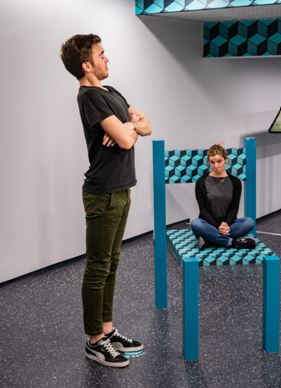 Il est incroyable de voir à quel point la taille perçue d’une personne dépend du contexte qui est suggéré par les objets autour. C’est en s’asseyant tout simplement sur une chaise que les lois de la perception sont explorées et les proportions modifiées !