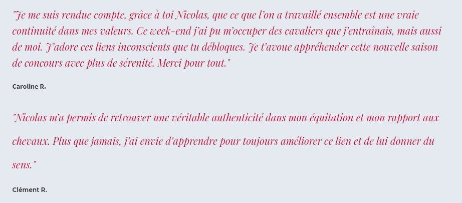La performance éthique pour tous. Son approche permet d’arriver à un niveau de performance identique, voire supérieur, de façon rapide et efficace tout en préservant le bien-être de son cheval. Elle a aussi l’avantage de pouvoir être appliquée par tous les cavaliers ! Nicolas coache des cavaliers de loisirs et de concours amateurs, ainsi que des professionnels (il coache actuellement 2 cavaliers de dressage de haut niveau).