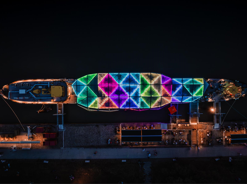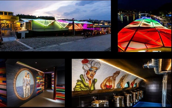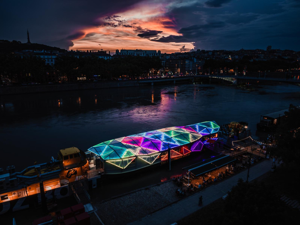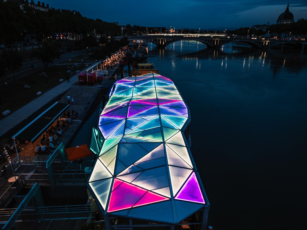 Cette structure ingénieuse permet une véritable scénographie lumineuse en fonction des événements. Elle apporte ainsi un contraste saisissant avec les autres bateaux amarrés le long des quais du Rhône !