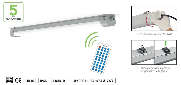 Via une télécommande capable de piloter un ensemble illimité de luminaires, il est possible de programmer le temps d’allumage après détection, le niveau d’éclairage de veille, le temps d’éclairage de veille, la distance de détection et la sonde crépusculaire.