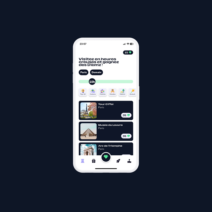 L’utilisateur est alors récompensé par l’attribution de points (il peut aussi en recevoir en signalant le niveau d’affluence), qu’il pourra convertir en avantages dans les sites touristiques partenaires. Ex. : entrées à tarifs réduits aux bons horaires.