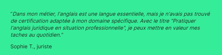 Certifiée France Compétences, cette certification TAILC (Targeted Industry Language Certificate) a été créée en collaboration avec des experts du domaine juridique. Elle répond ainsi parfaitement aux exigences réelles des professionnels du droit.
