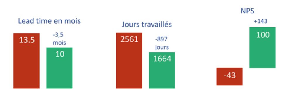 L’équipe qui se sentait à bout de souffle a aussi été interviewée sur la mise en place de ces nouvelles méthodes, la note donnée a été de 8.71/10. Les mots les plus employés lors du tour de table en fin d’accompagnement ont été : enrichissant, challengeant, métamorphose, fierté, dynamique…