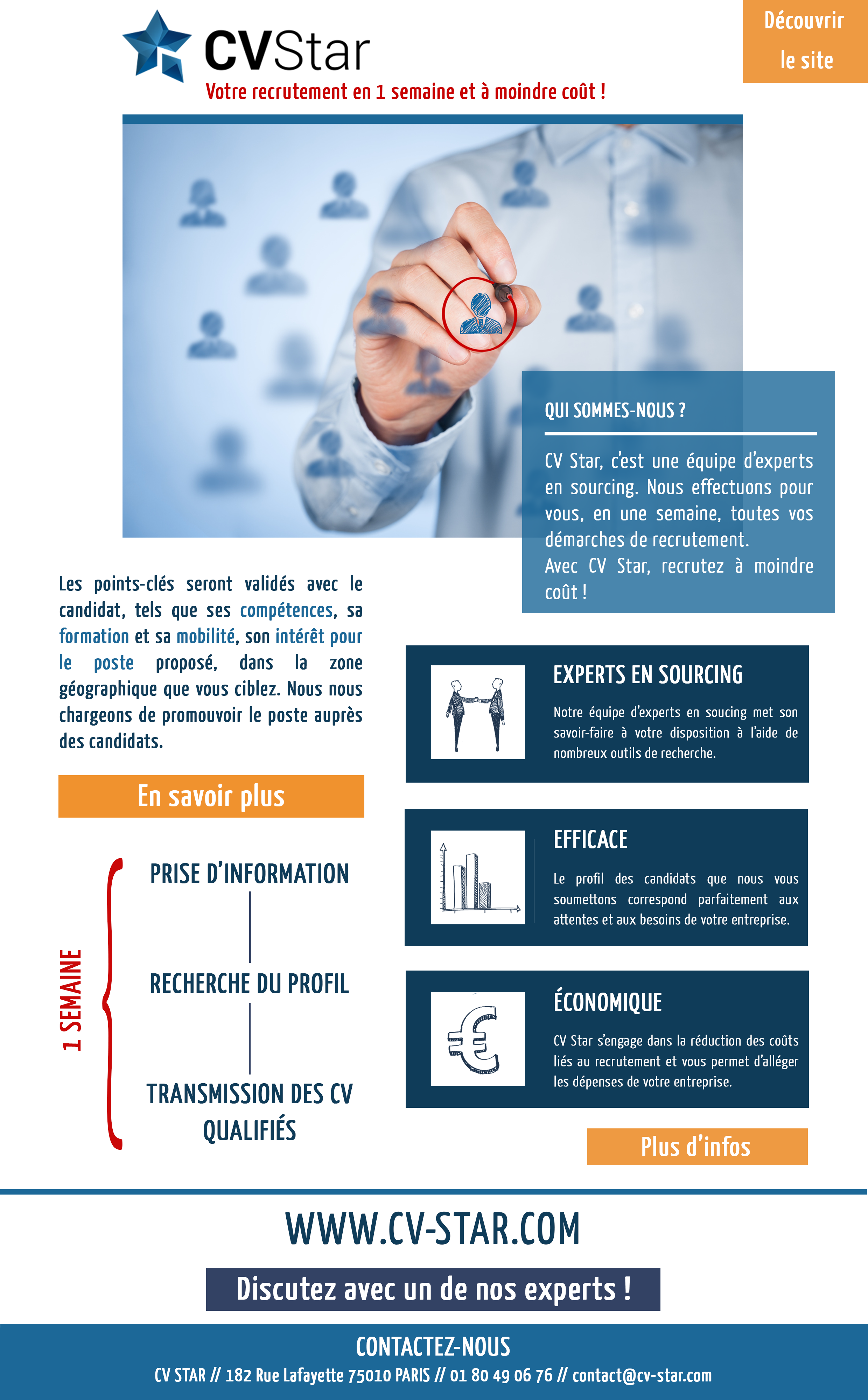Pourtant, le marché de l’emploi français étant en stagnation, la demande étant largement supérieure à l’offre, les entreprises ont besoin de déléguer leurs travaux de recrutement à des sociétés qualifiées. Comme les cabinets de recrutement ou les chasseurs de tête, CV Star pratique le sourcing actif, c’est à dire la recherche du profil adéquat à la source. Une méthode rapide et efficace qui permet de se concentrer sur les profils les plus pertinents et les plus en adéquation avec le profil recherché. Le sourcing chez CV Star est effectué par des spécialistes de la recherche de curriculum vitae, qui savent identifier par de nombreux moyens les collaborateurs idéaux.