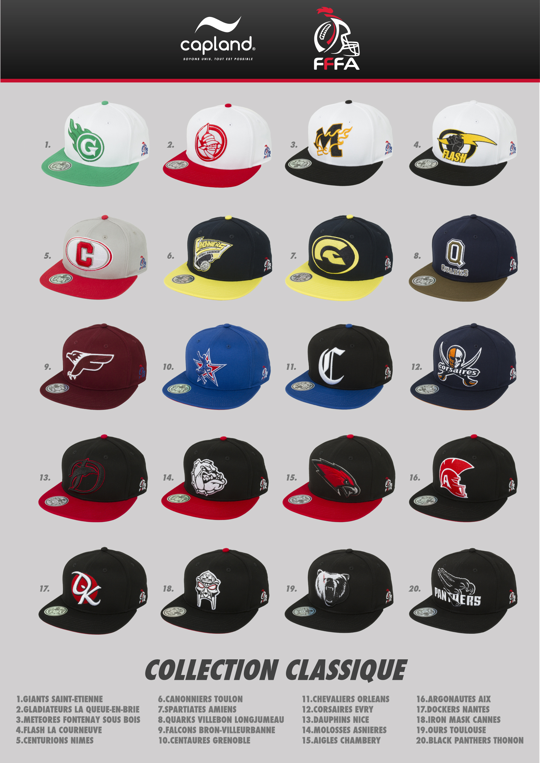 Capland a acquis les droits de la Fédération Française de Football Américain ainsi que ceux de 21 clubs de football américain pour lancer la première collection de casquettes connectées à l’effigie des équipes. Les snapback les plus célèbres sont celles de LA, de NY ou encore des Chicago Bulls. Au tour des équipes françaises de pouvoir afficher sur toutes les têtes la puissance de leurs équipes. Chaque casquette porte le logo de son équipe, brodé et en relief, ainsi qu’une pastille réalisée par le graffeur Bebar, artiste de la scène street art, mentionnant la devise de Capland : « Soyons unis, tout est possible ». Capland apporte un soin tout particulier à la qualité des matériaux utilisés et à la durabilité et la solidité de l’ensemble de ses produits.