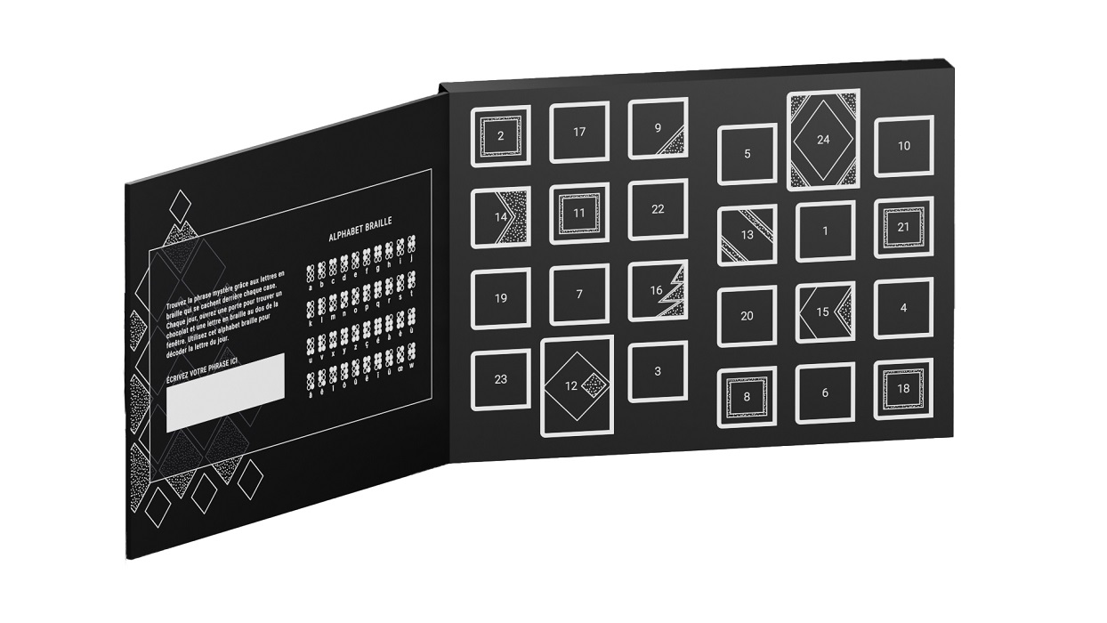 - Sa démarche tactile invite à une sensibilisation au braille : derrière chaque fenêtre, les gourmets vont décoder une lettre en braille pour composer une phrase à la fin du mois.