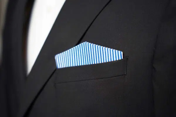 Cette pochette aux formes géométriques s’accordera harmonieusement avec un costume trois-pièces et avec une veste bleue (à porter avec un pantalon ton sur ton, mais aussi avec un chino beige ou rouge pour un look chic et branché)).
