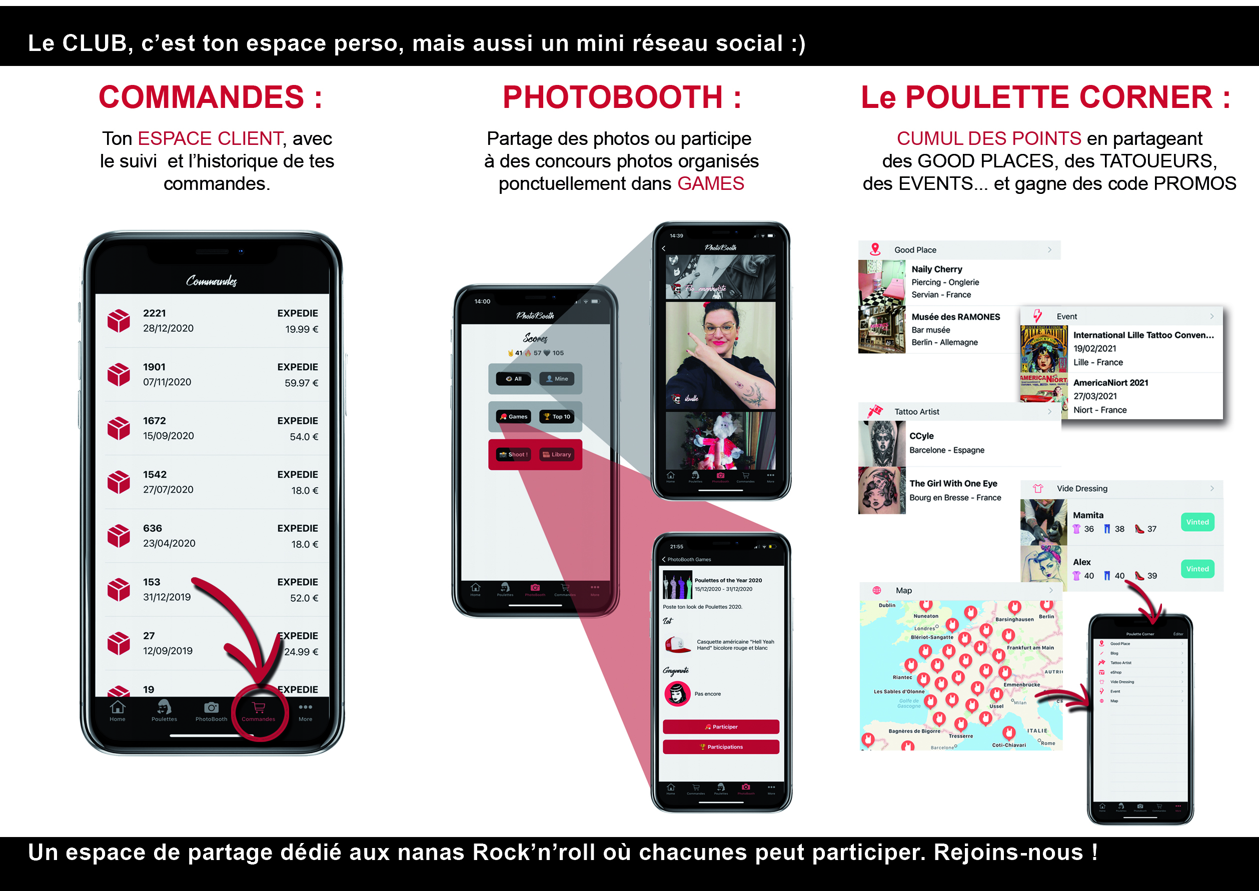 100% féminin, Le Poulette Club est destiné à toutes celles qui aiment l’esprit pin-up rock, la musique qui swing ou celle qui fait du bruit, les tatouages, les motos, les vieilles voitures…